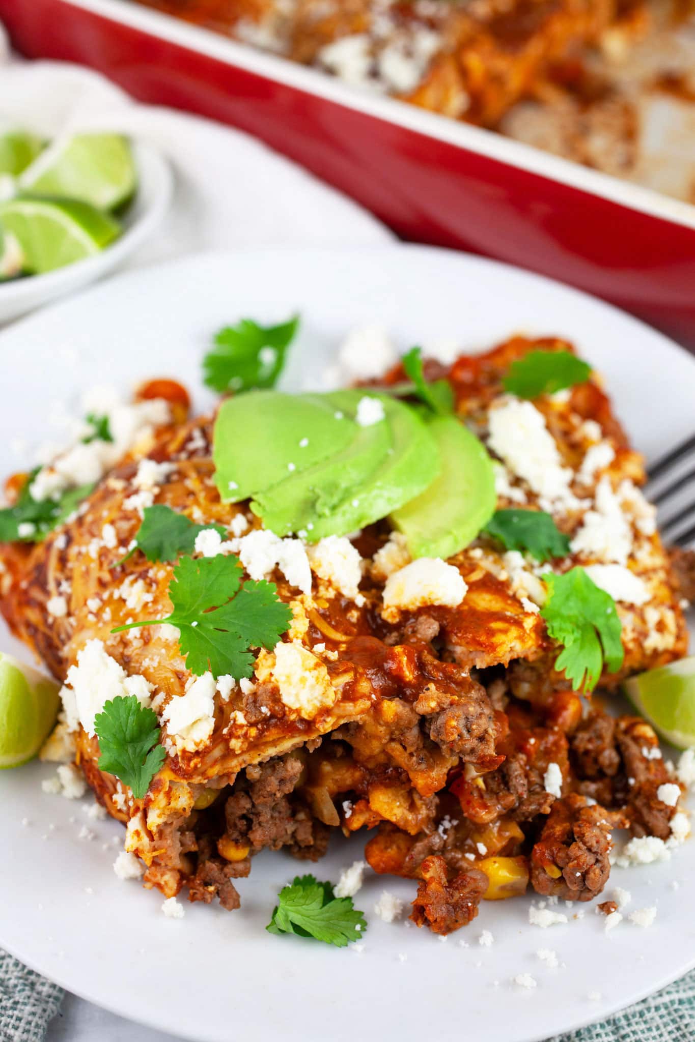 - To Serve: Garnish the enchiladas with Queso Fresco, cilantro, sliced avocadoes, and cilantro, or any toppings of choice (optional).