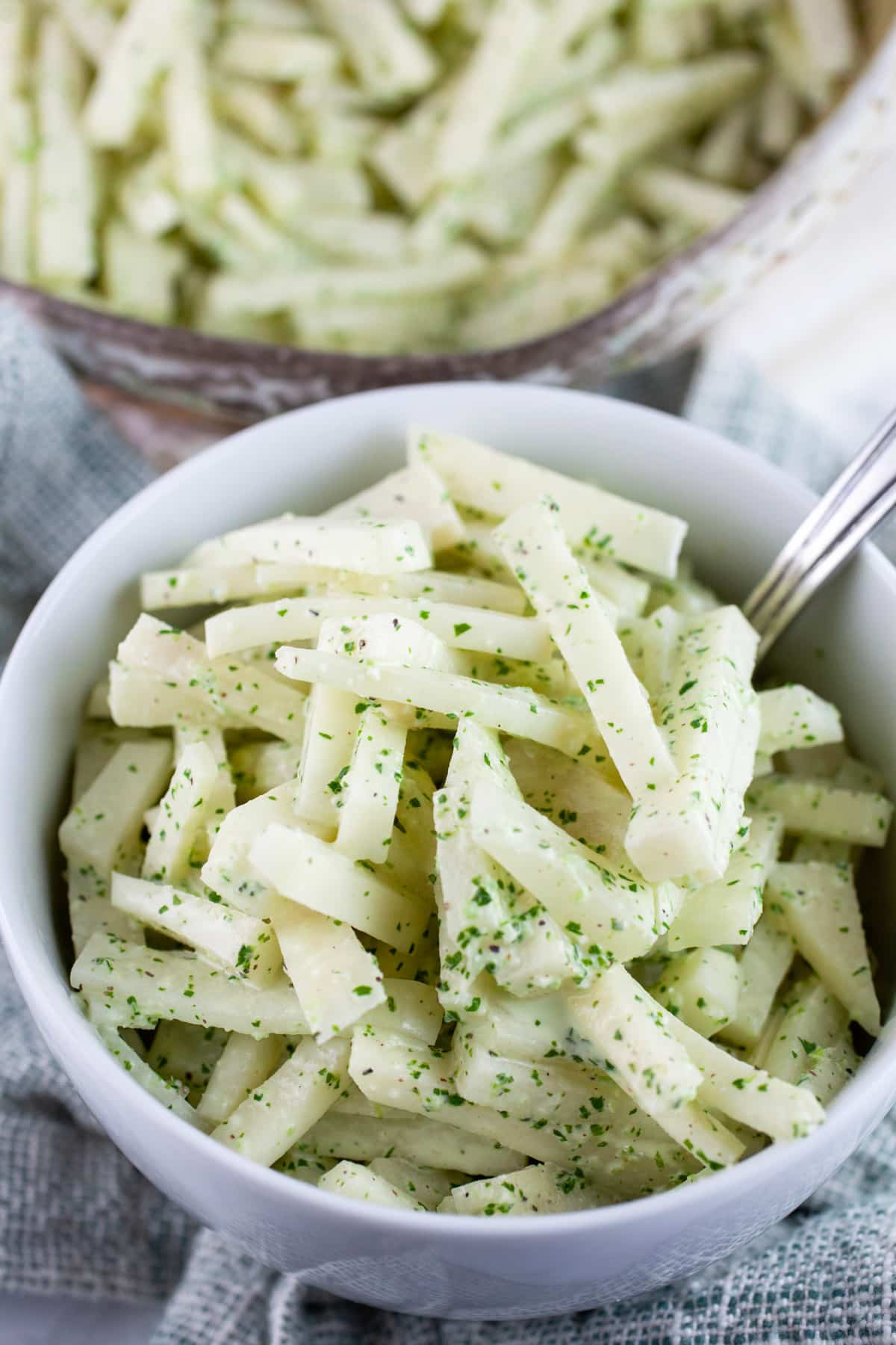 - Pour the cilantro lime dressing over the kohlrabi a bit at a time and toss until completely combined.