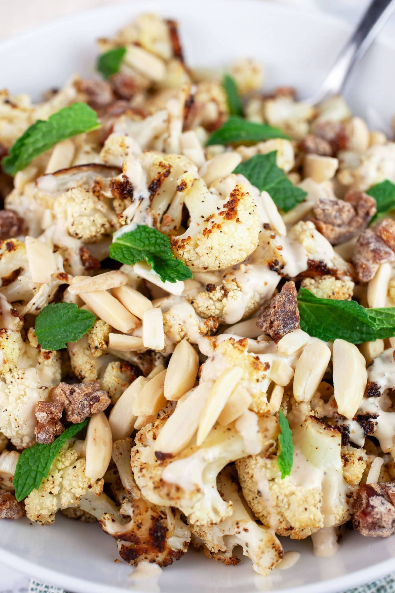 - To Serve: Serve the cauliflower on a platter and drizzle with desired amount of the tahini sauce. Add the toasted almonds (or nuts of choice) and ⅓ cup of dried, chopped dates (or dried fruit of choice). Mince 2 Tbsp. of fresh mint, parsley, chives, or basil and garnish (optional).