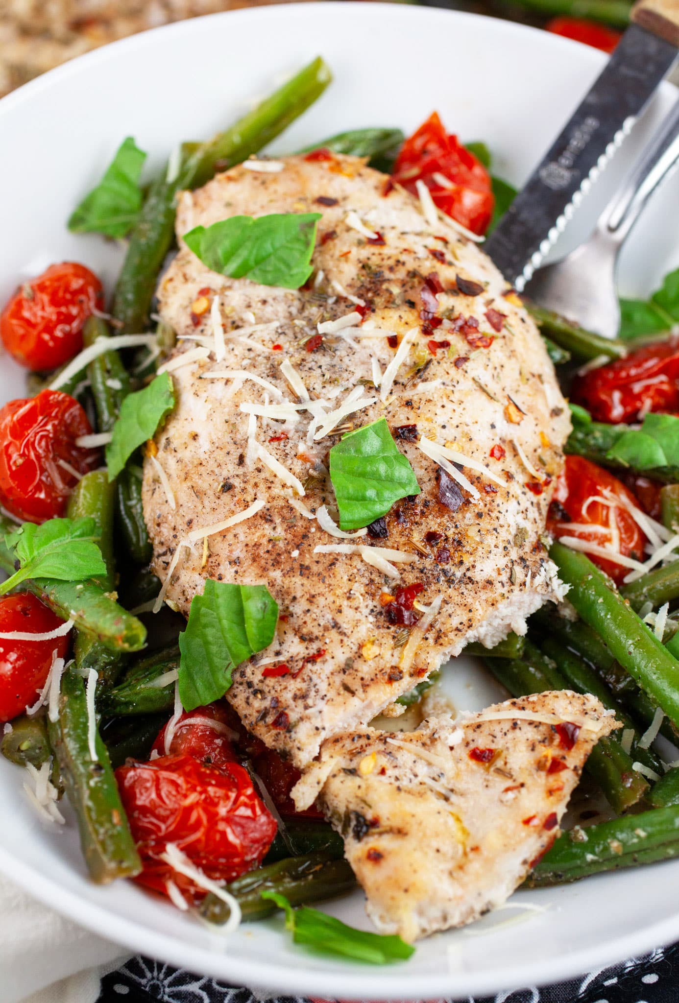 - To Serve: Serve the roasted chicken, green beans, and tomatoes with some grated Parmesan or Asiago cheese and garnish with fresh basil, parsley, or herbs of choice (optional).